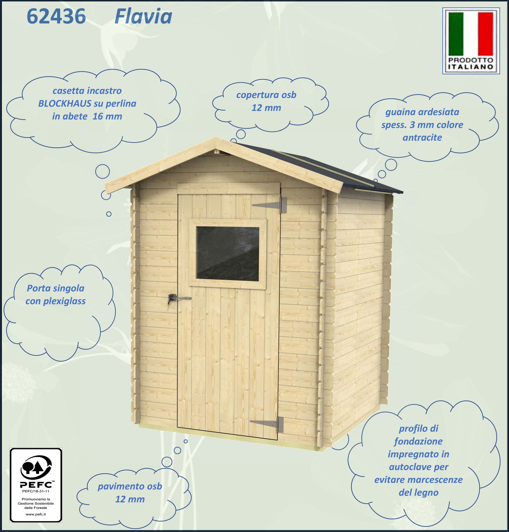Casetta in legno naturale modello Flavia, con costruzione ad incastro e pareti da 16 mm. Dotata di porta finestrata in plexiglas, pavimento in OSB e tetto con guaina impermeabile.