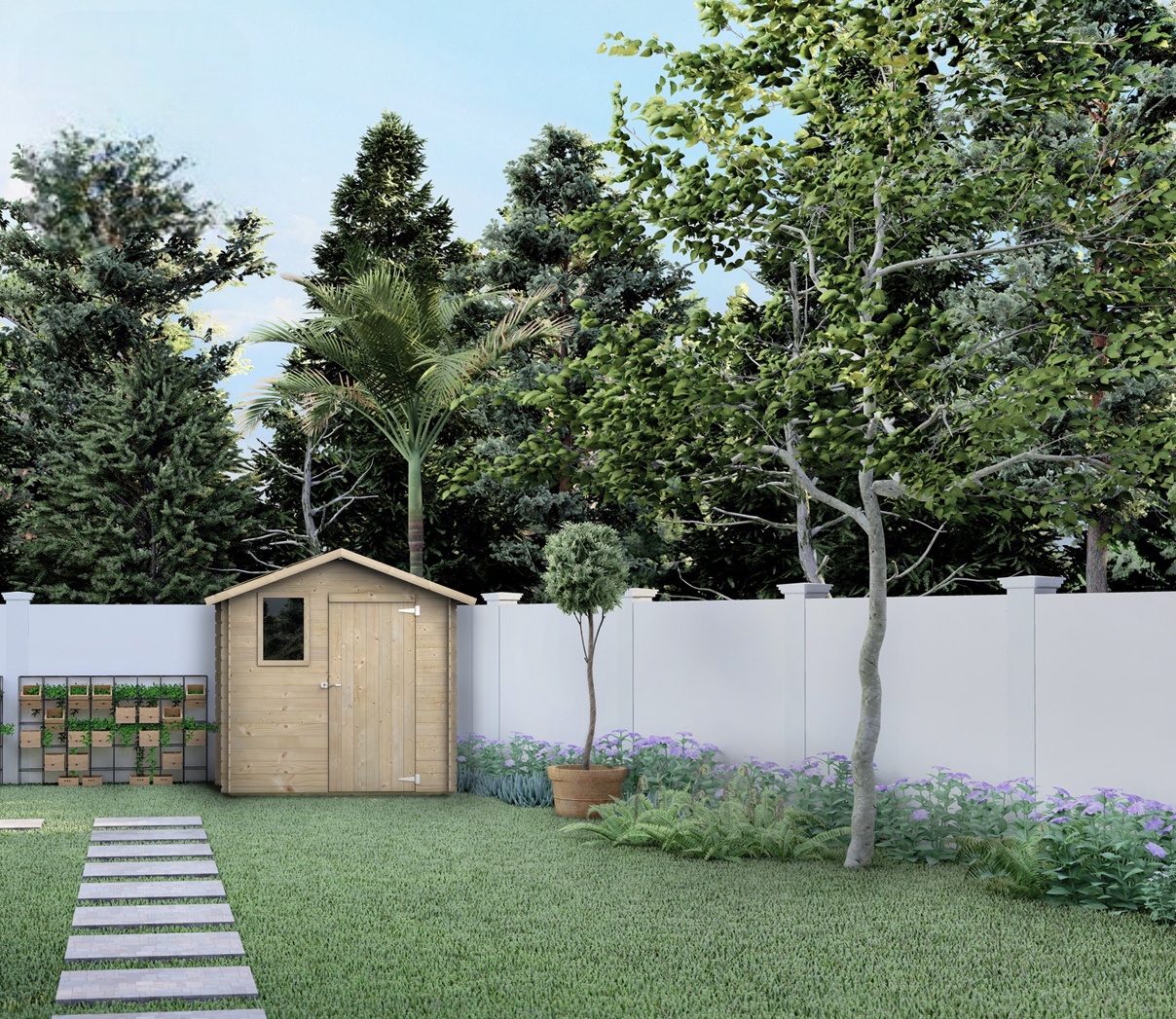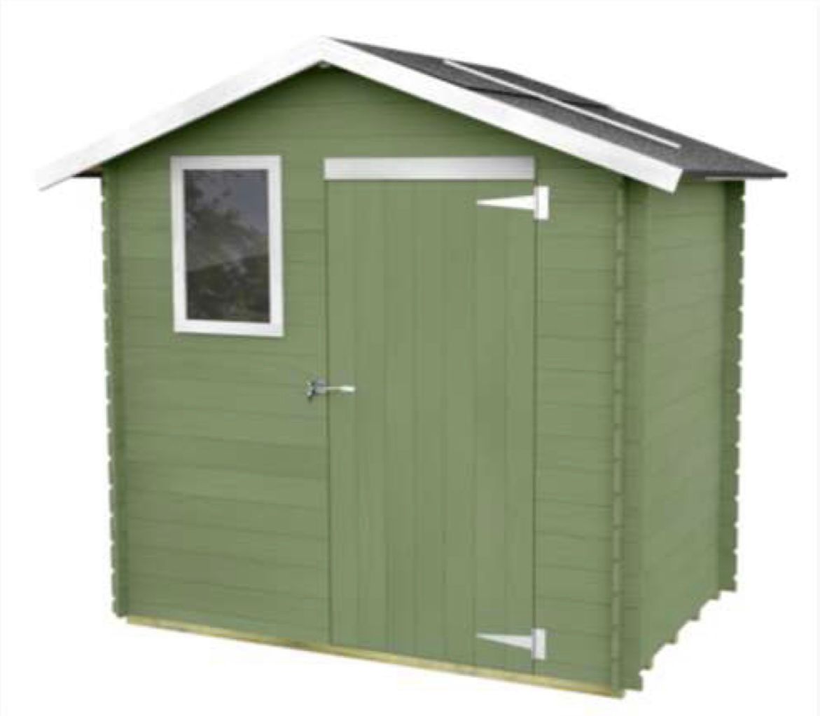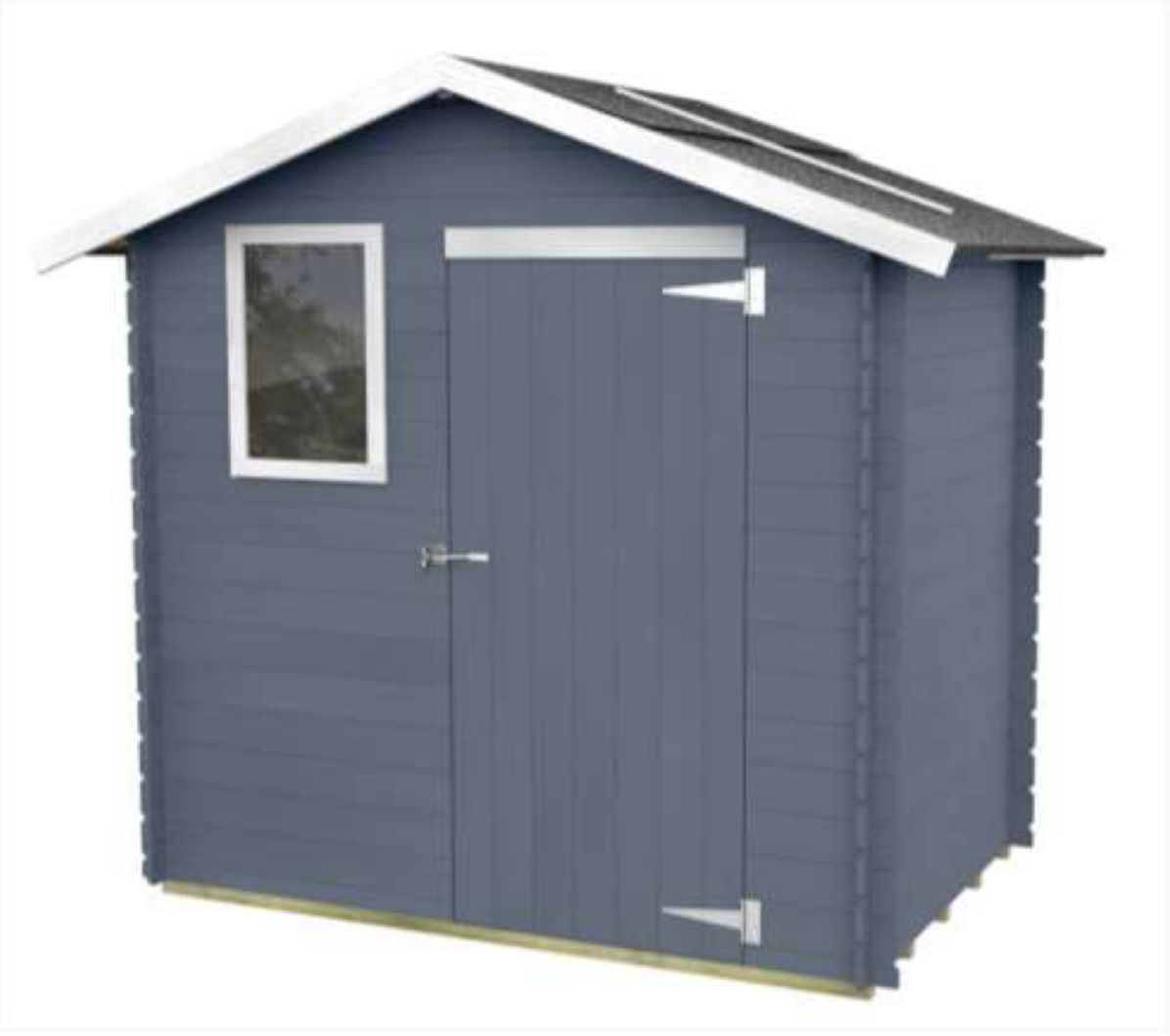 Casetta da giardino in abete naturale con struttura ad incastro, porta cieca e finestra fissa in plexiglas. Pavimento e tetto in OSB con guaina impermeabile inclusa.