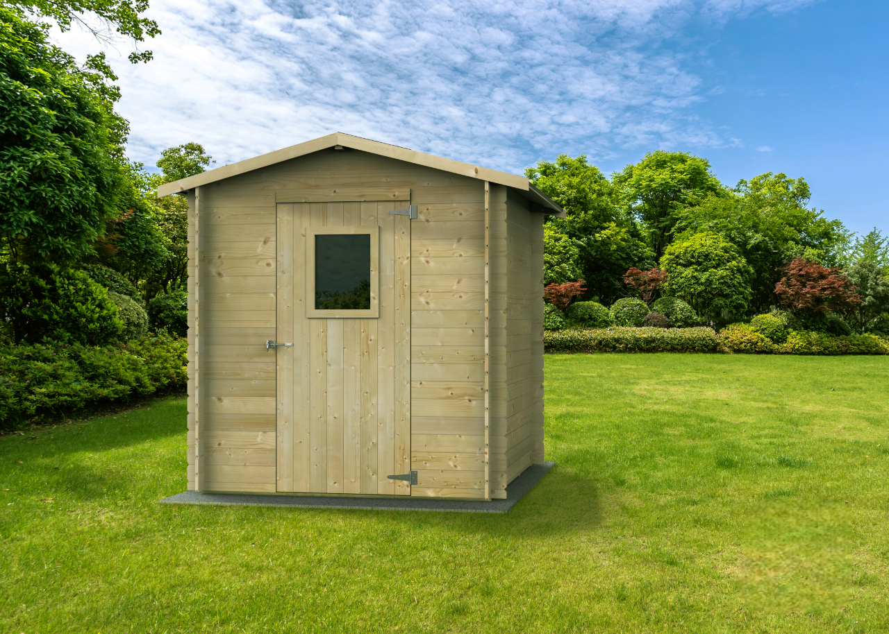 Casetta in legno naturale modello Regis, costruita con sistema ad incastro, ideale come ripostiglio per attrezzi, spazio hobby o piccolo ricovero in giardino. Struttura solida, tetto impermeabilizzato, pavimento incluso e porta finestrata con plexiglas.