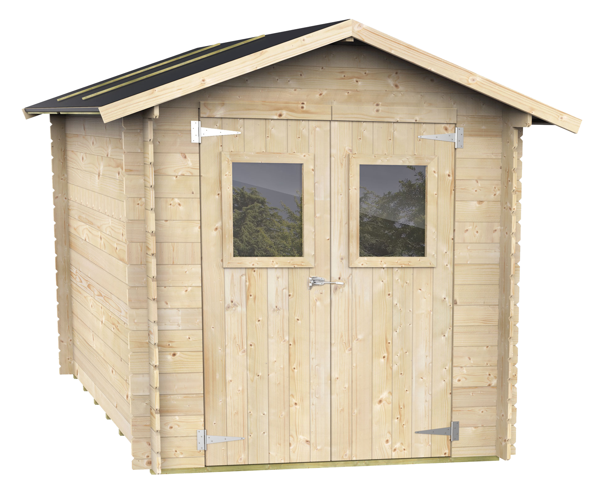 Progettata in abete naturale con sistema ad incastro, include pareti da 19 mm, tetto impermeabilizzato, pavimento incluso e porta doppia in plexiglas.