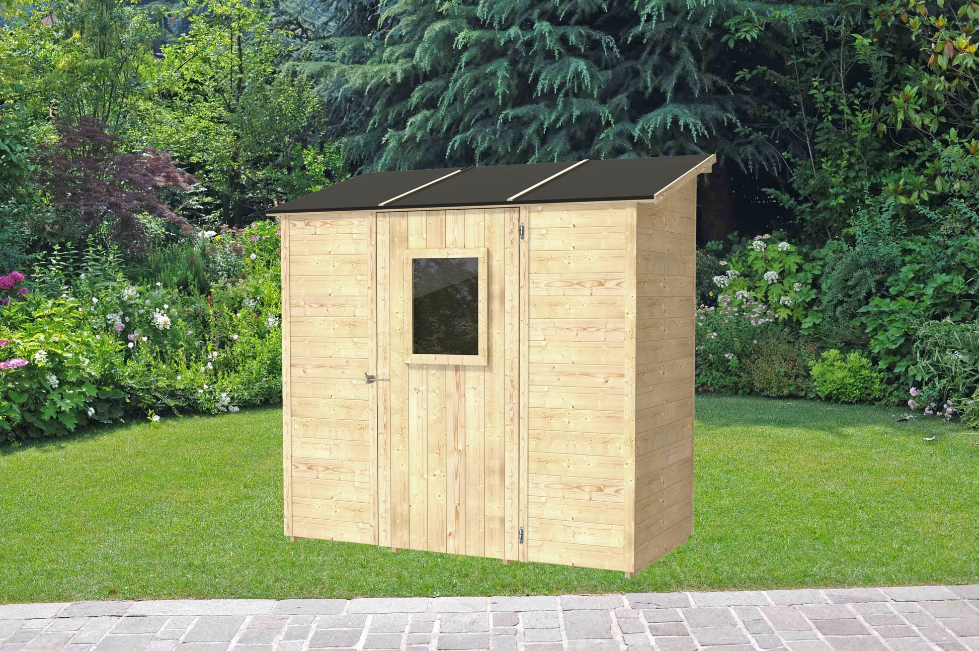 Casetta in legno naturale d'abete con struttura a pannelli, porta finestrata, pavimento incluso e tetto impermeabilizzato.