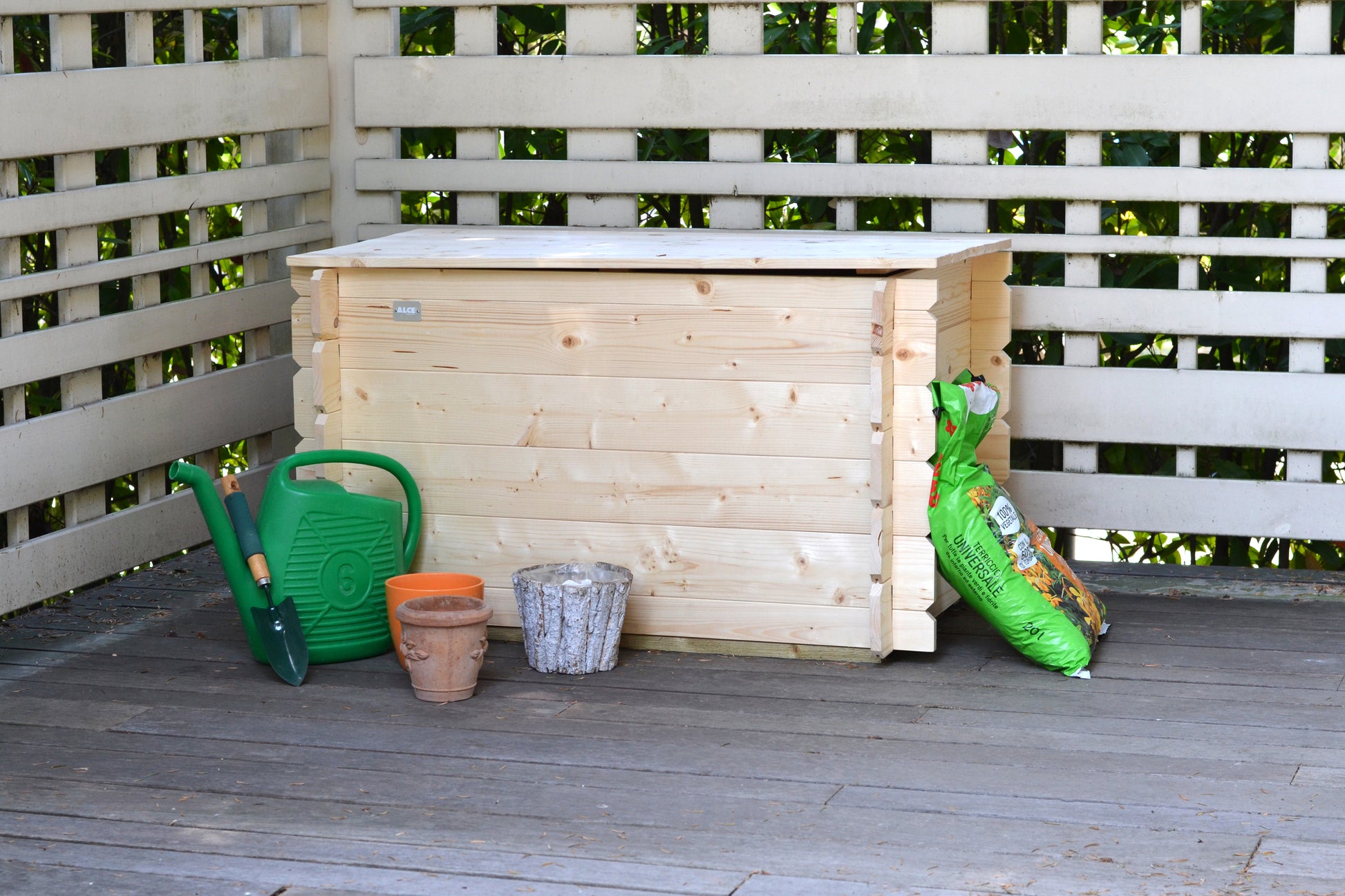 Il coperchio a battente con compasso assicura un’apertura pratica e sicura, mentre il fondo perlinato con travi di fondazione permette il corretto passaggio dell’aria, mantenendo il contenuto asciutto.